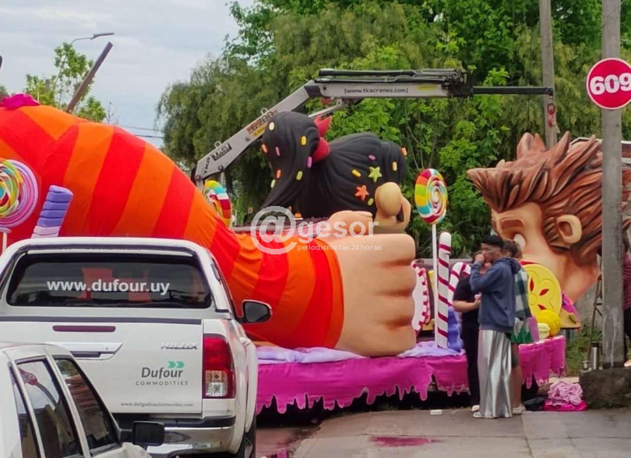 Para ello también se tuvo en cuenta que los carros estaban guardados en sus galpones y restaba culminar el armado, con aquellas partes que se colocan con el carro ya en la calle, como lo muestra la fotografía de la carroza del grupo de UTU que en su local de Río Negro casi Iris de López Crespo, a las 12.24 horas con un guinche se aprestaba a colocar la cabeza a la figura del personake principal, para poder estar prontos para las 14.00 horas e iniciar el desfile, que como siempre concita la atención de miles de personas de la región.