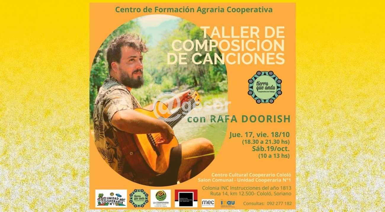 El músico Rafa Doorish estará realizando un "Taller de composiciones" y un concierto de música, en la Unidad Cooperaria Nº 1, Cololó. Estas dos actividades se dan en el marco del Curso de Cría de Terneros y Manejo de pasturas en el Centro de Formación Agraria Ccoperativa, de Tierra Que Anda en convenio con INAU.