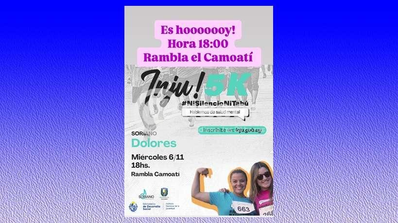 Desde el Municipio de Dolores se informa que el INJU está organizando una 5k. Será este miércoles 6 de de noviembre, a las 18 horasen la rambla el Camoatí, denominada “Hablemos de Salud Mental: ni silencio ni tabú”.