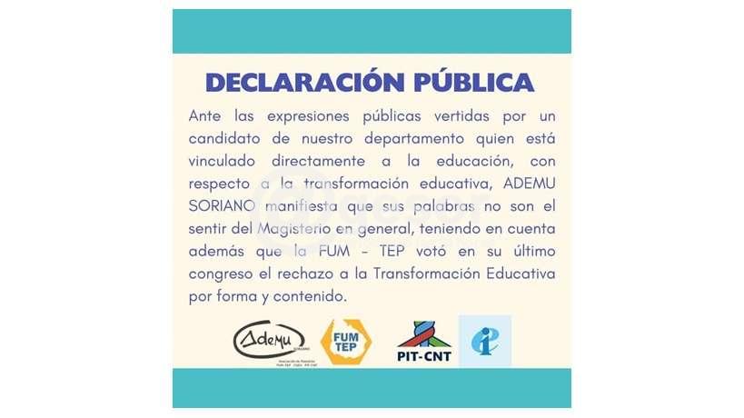 "Ante las expresiones públicas vertidas por un candidato de nuestro departamento quien está vinculado directamente a la  educación, ADEMU SORIANO manifiesta que sus palabras no son el  sentir del Magisterio en general, teniendo en cuenta además que la FUM-TEP votó en su último congreso el rechazo a la Transformación Educativa por forma y contenido".