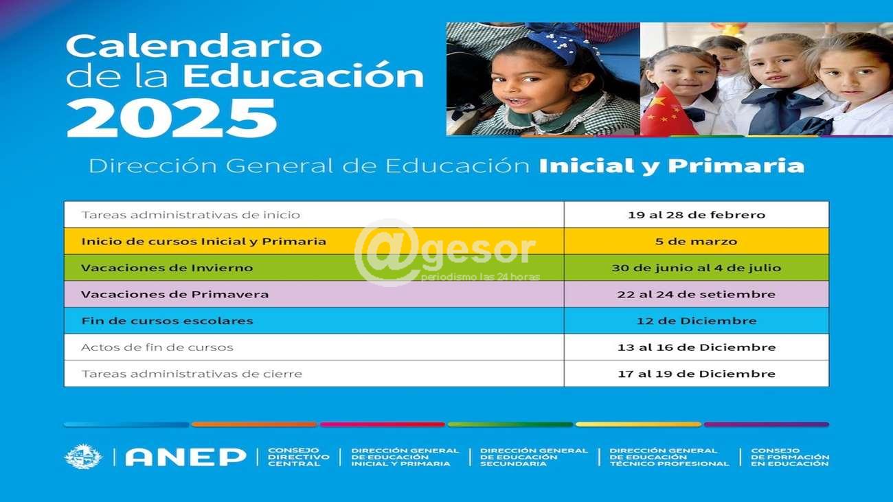 En Educación Primaria, los escolares iniciarán el año lectivo 2025, el 5 de marzo. Las vacaciones de invierno se desarrollarán entre el 30 de junio y el 4 de julio, y el receso de setiembre del 22 al 24 de setiembre. Las clases culminarán el 12 diciembre de 2025.