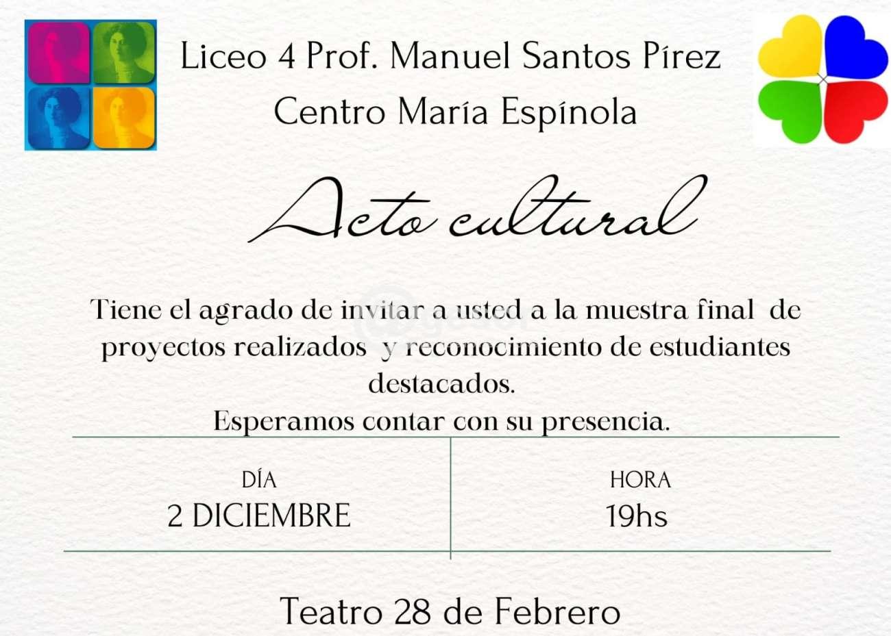 Liceo 4 ¨Manuel Santos Pírez¨ Centro María Espínola realiza este lunes 2 de diciembre su acto cultural con la muestra final del año