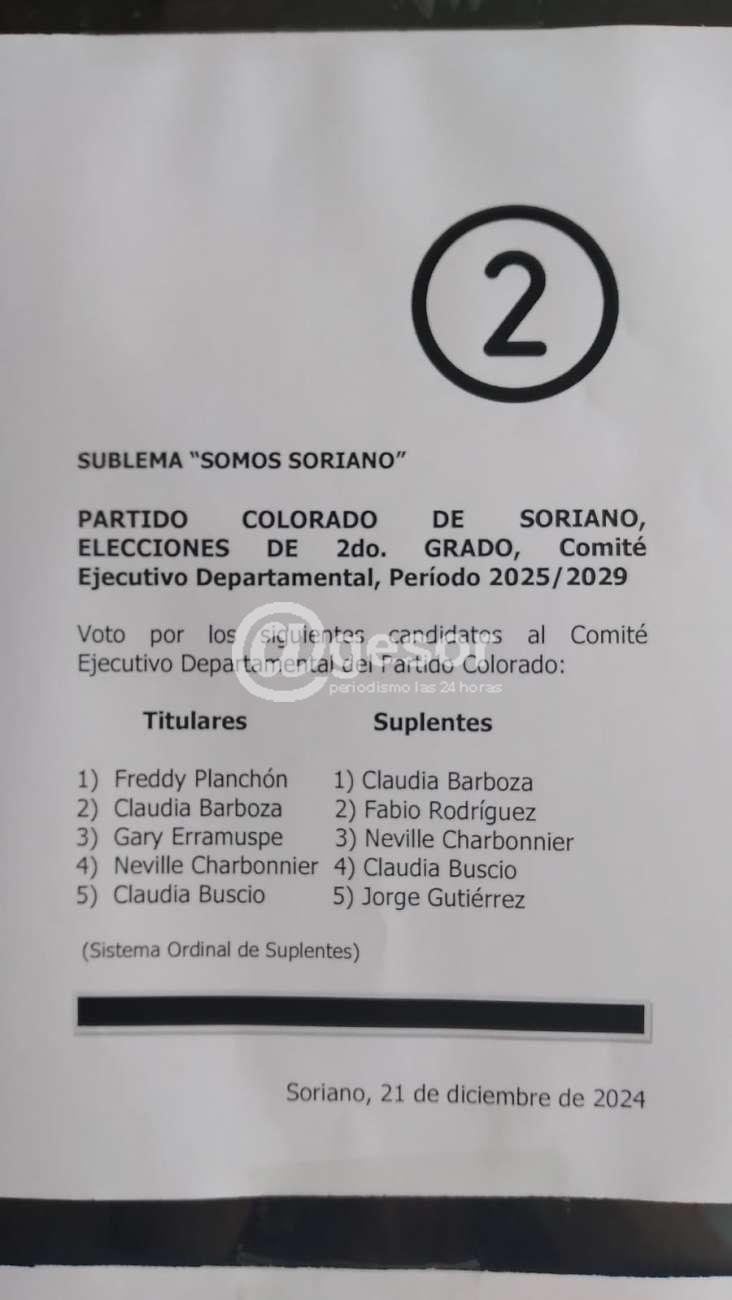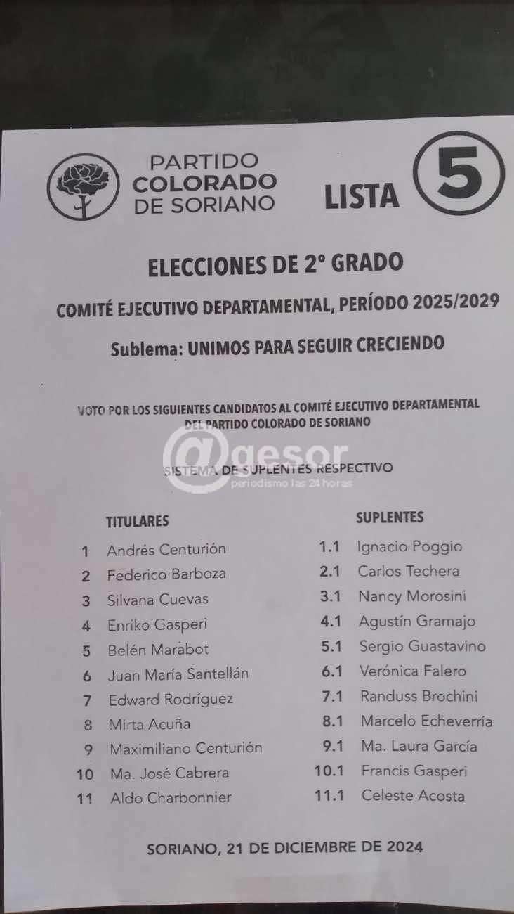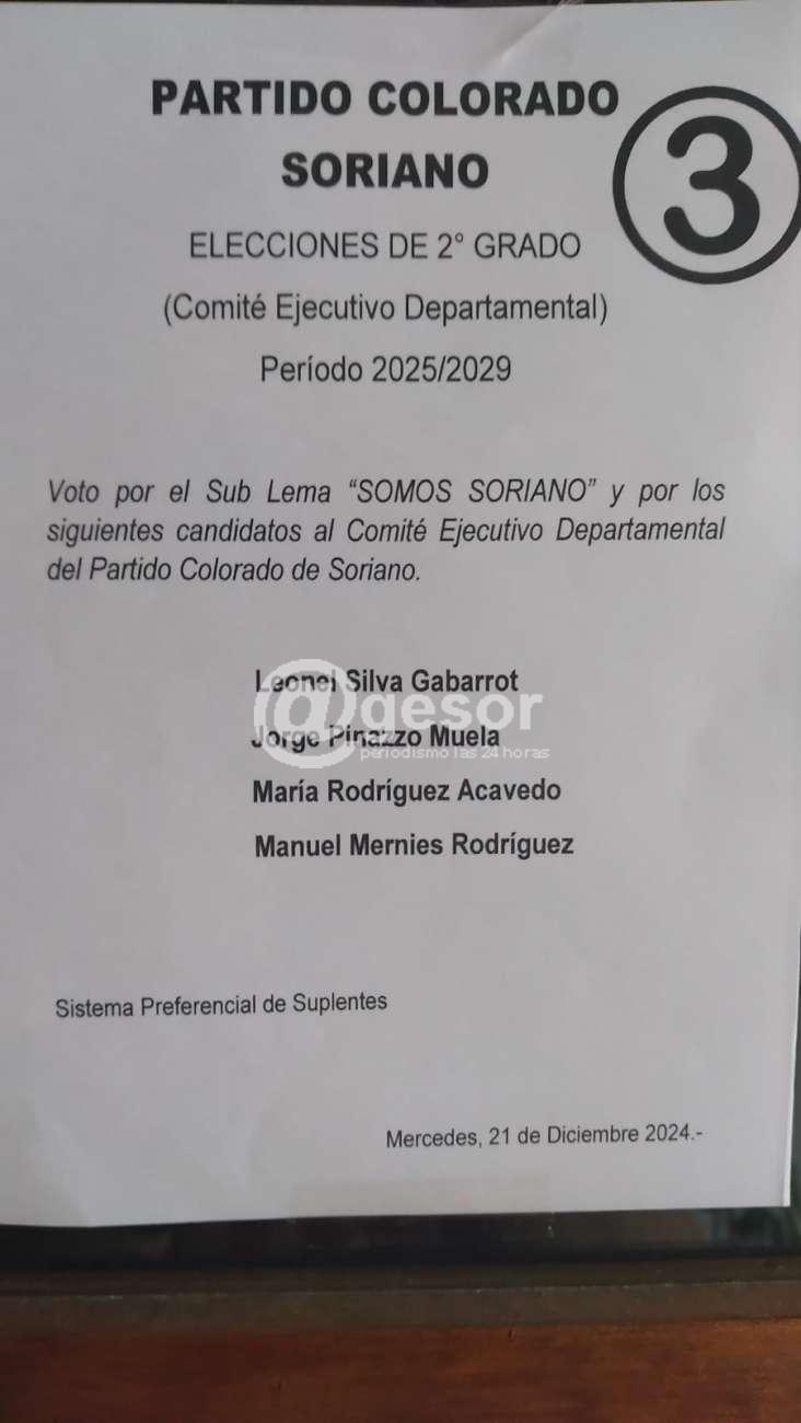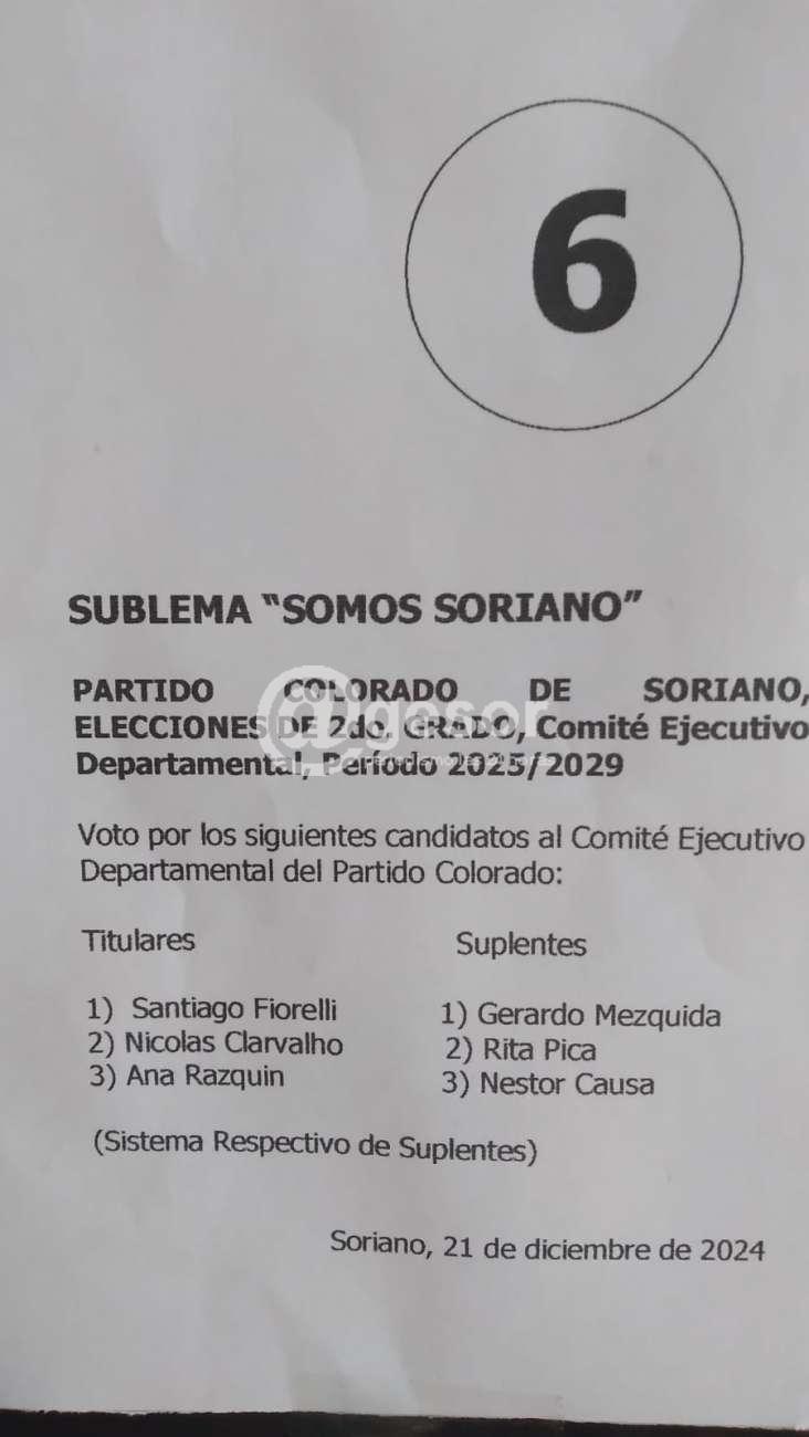 Los 68 convencionales departamentales del Partido Colorado de Soriano elegirán el sábado 21 de diciembre su Comité Ejecutivo Departamental. Se presentaron seis opciones. La lista 1 encabezada por Martín Melazzi, la 2 por Freddy Planchón, la 3 por Leonel Silva, la 4 por Jorge Marroig, la 5 por Andrés Centurión y la 6 por Santiago Fiorelli.