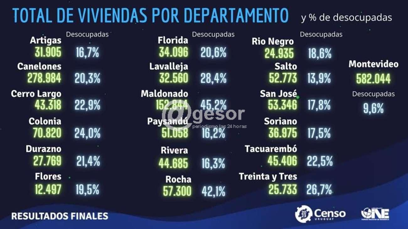 Los resultados del Censo 2023, revelan que de 1.659.048 viviendas registradas en todo el país, el 19,5% se encuentran desocupadas. Este porcentaje representa un desafío significativo para la planificación y uso eficiente de los recursos habitacionales en Uruguay.