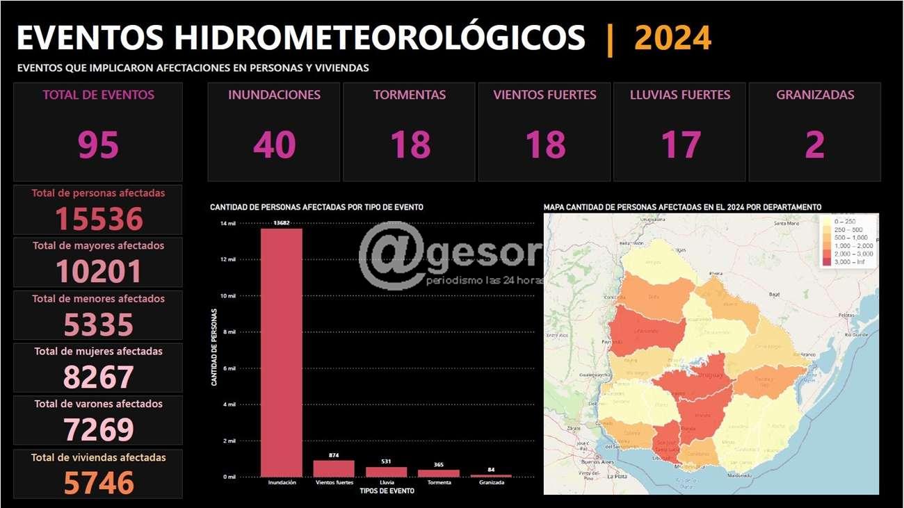 En Uruguay, la mayoría de los eventos adversos son de origen hidrometeorológico y el año pasado no fue la excepción. En 2024, se registraron un total de 95 eventos de este tipo: 40 inundaciones, 18 tormentas, 18 episodios de vientos fuertes, 17 eventos de lluvia y 2 granizadas. Cabe aclarar que a los efectos del presente balance solo se consideran aquellos que generaron algún tipo de afectación ya sea en viviendas o en personas.