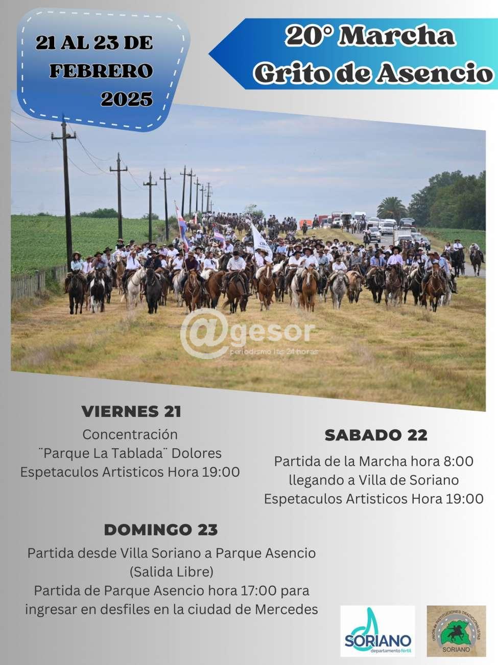 El sábado 22 la partida de la marcha será a la hora 8.00 llegando a Villa Soriano donde desde las 19.00 horas se desarrollarán espectáculos artísticos.