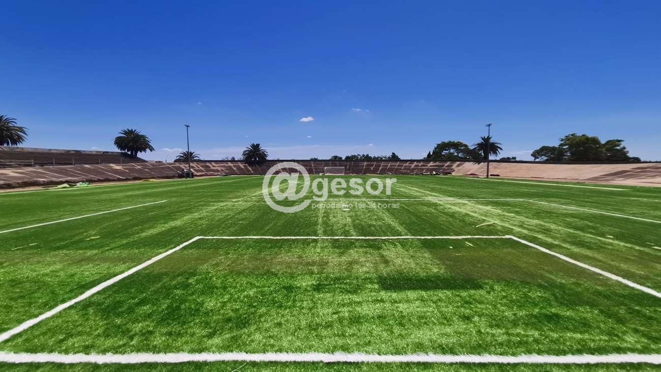 Ingresan en fase final los trabajos para conformar la cancha de fútbol infantil con césped sintético en el velódromo municipal “Leonel Rocca”.