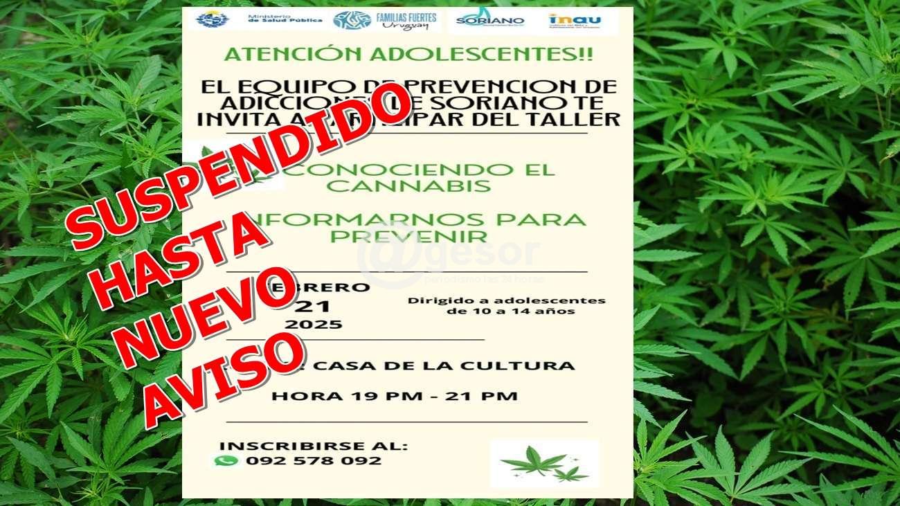 El Equipo Departamental de Prevención en Adicciones informa que, debido a un imprevisto de fuerza mayor, el taller sobre el tema Conociendo el Cannabis, que estaba programado para hoy en la Casa de la Cultura a la hora 19, ha sido suspendido.