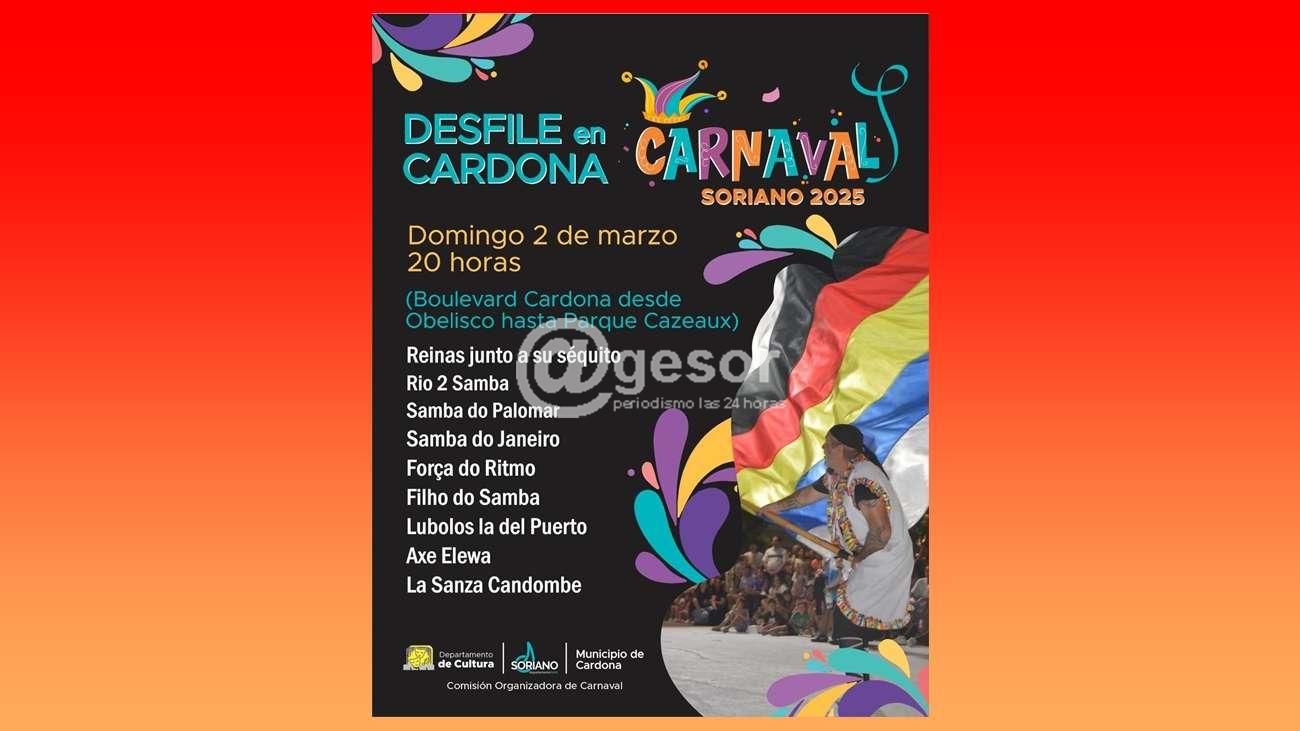 El domingo 2 de marzo Cardona tendrá su desfile de Carnaval. Será a partir de las 20 horas. La celebración recorrerá el Boulevard Cardona, iniciando en el Obelisco y finalizando en el Parque Cazeaux.