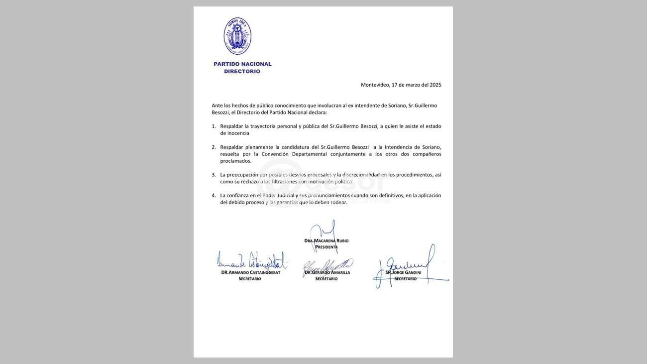 Ante los hechos de público conocimiento que involucran al ex intendente de Soriano, Sr. Guillermo Besozzi, el Directorio del Partido Nacional declara: