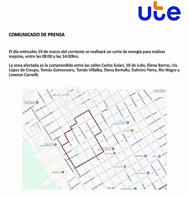 Este miércoles 19 de marzo se realiza un corte de energía para efectuar mejoras, entre las 8.00 y las 14.00 horas en Dolores.