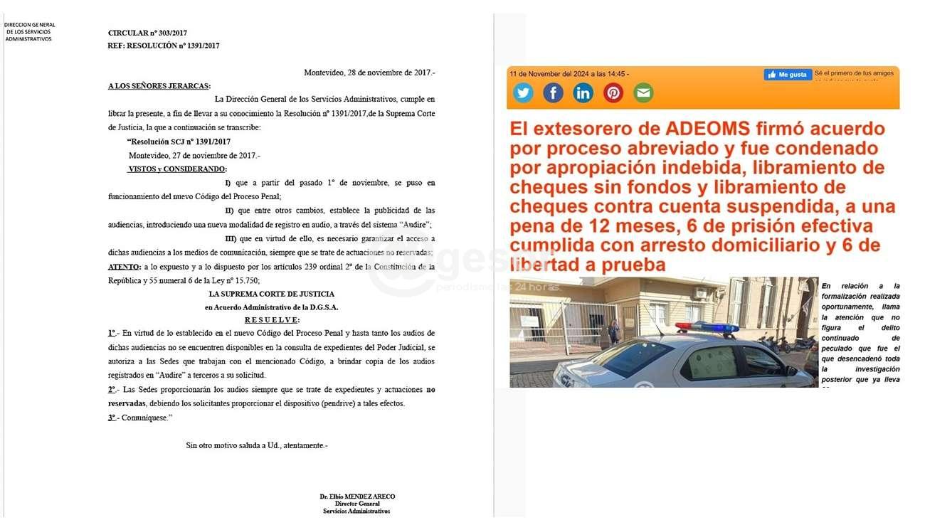 (*) Fotos: Circular Nº 303/2017 de la Suprema Corte de Justicia que establece el mecanismo cómo se pueden acceder al audio de las audiencias públicas; y portada de la noticia difundida por @gesor el 10 de noviembre y republicada el 11.