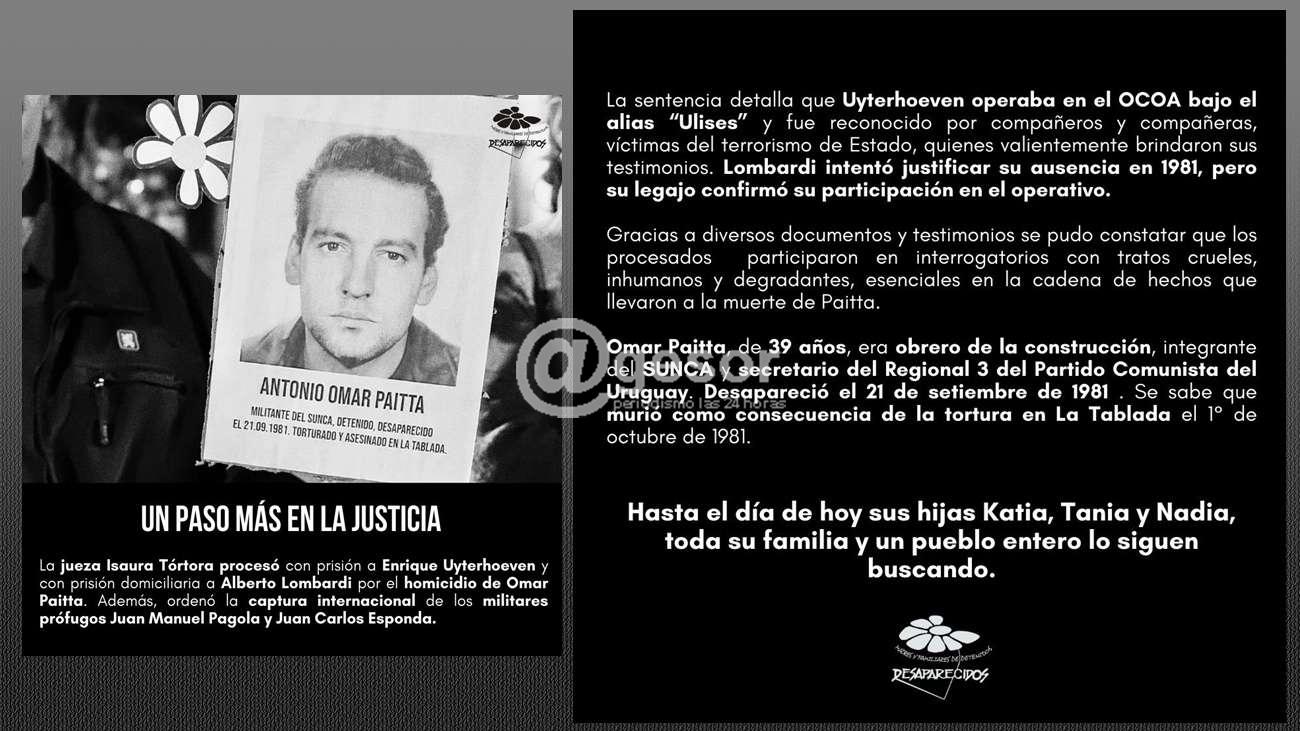 La jueza Isaura Tórtora procesó con prisión a Enrique Uyterhoeven y con prisión domiciliaria a Alberto Lombardi por el homicidio de Omar Paitta, asesinado en 1981 en el centro de torturas La Tablada. También ordenó la captura internacional de Juan Manuel Pagola y Juan Carlos Esponda, quienes se encuentran prófugos.