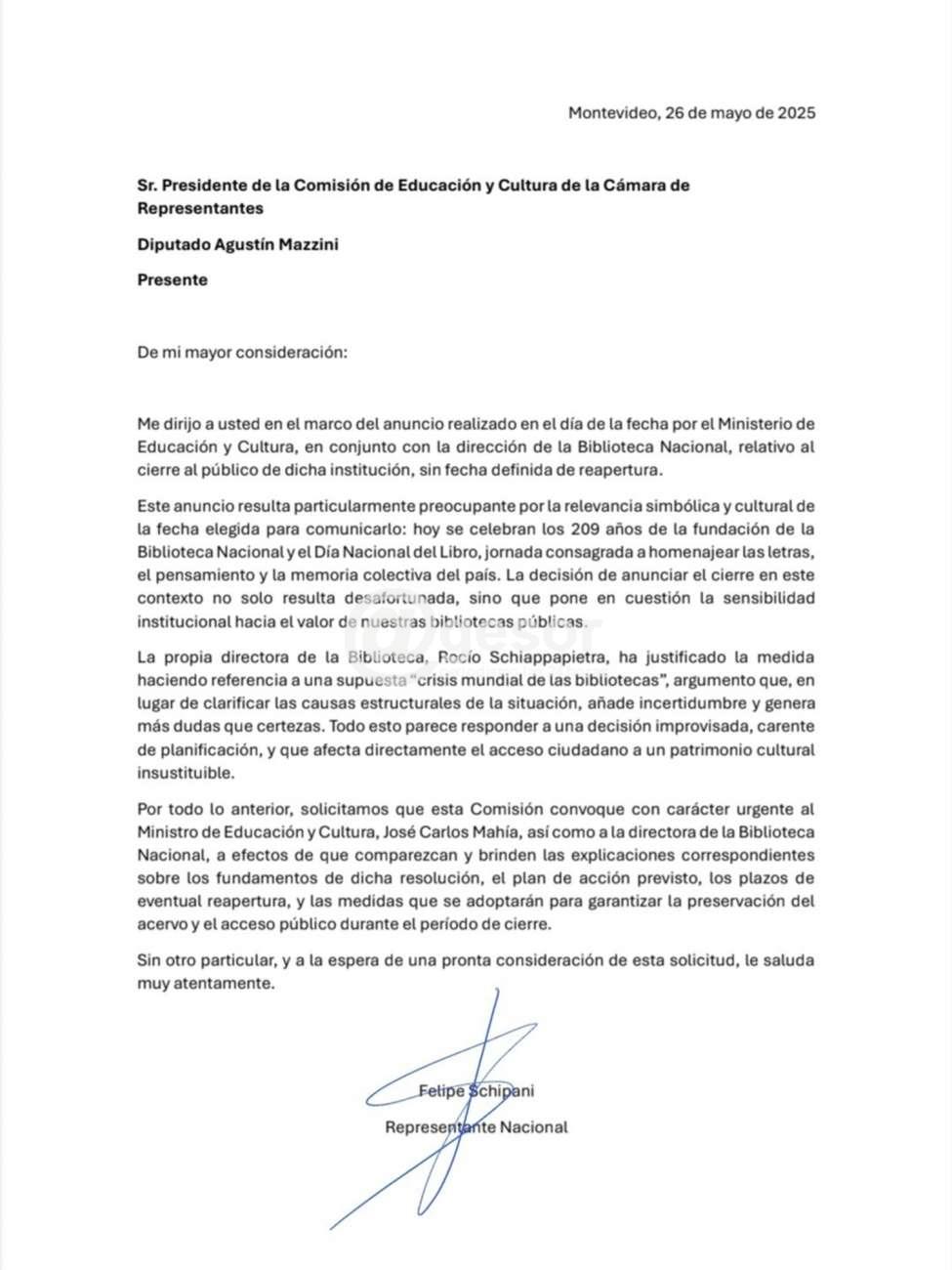 En la nota elevada al presidente de la Comisión de Educación y Cultura de Diputados, Schipani expresa que es “particularmente preocupante” el anuncio realizado del cierre de la Biblioteca Nacional, por lo que pide se cite al Ministro de Educación y Cutura, y a su directora Rocío Schiappapietra paraque brinden las explicaciones “sobre los fundamentos de dicha resolución, el plan de acción previsto, los plazos de la eventual reapertura, y las medidas que se adoptarán para garantizar la preservación del acervo y el acceso al público durante el período de cierre”.