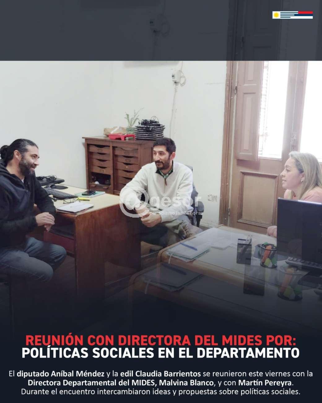 Este viernes, diputado Aníbal Méndez y la edil Claudia Barrientos se reunieron con la Directora Departamental del MIDES, Malvina Blanco, y con Martín Pereyra. El encuentro sirvió para intercambiar ideas y coordinar acciones en materia social para el departamento.