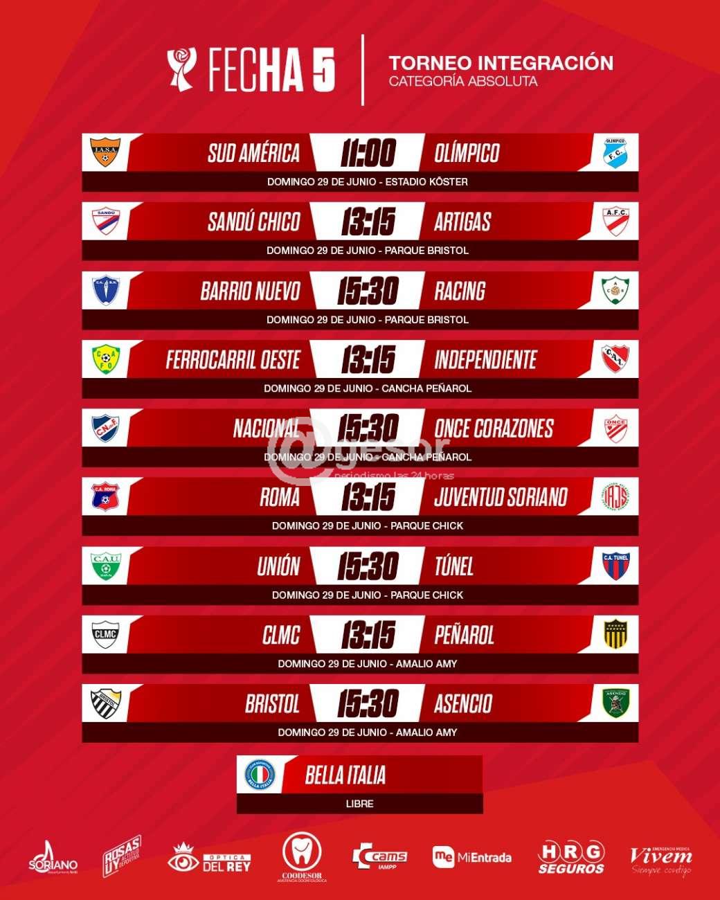 Se reunió la liga departamental de fútbol de Soriano bajo la presidencia del Dr. Pablo Marrero a los efectos de fijar la fecha cinco del torneo de categoría absoluta. El domingo se estará disputando el duelo de punteros entre Racing y Barrio Nuevo, en cancha de Bristol desde las 15 y 30 horas, mientras que en el mismo escenario a primera hora lo harán Sandú Chico se enfrentará a Artigas.