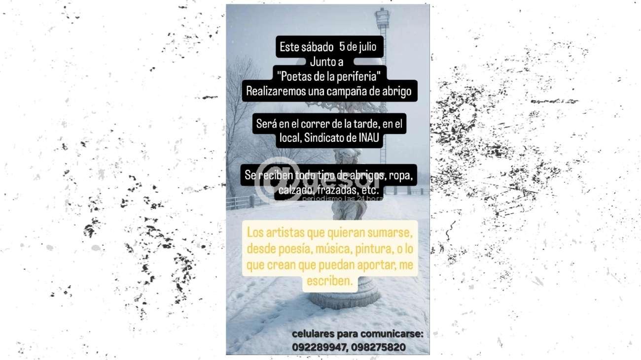 Esta campaña del abrigo se realizará en la sede del sindicato de INAU (Sánchez, casi 19 de abril) Mercedes, a partir de las 15 horas. Durante toda la tarde se realizarán exposiciones, intervendrán poetas y músicos al tiempo que se estará recibiendo todo tipo de abrigo para los más necesitados.: Ropa, calzado, frazadas, etc.