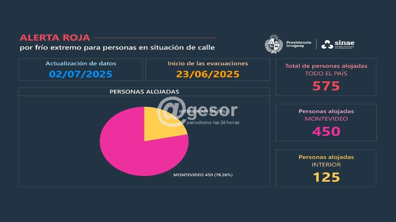 Continúa la alerta roja por frío extremo para personas en situación de calle en todo el territorio nacional. En la jornada del 2 de julio se brindó asistencia a 2.690 personas en todo el país, 2.115 a través del sistema de refugios del Ministerio de Desarrollo Social y 575 mediante los Centros de Evacuación. En la fecha se constató el fallecimiento de una persona, cuyo cuerpo fue hallado en la vía pública en la ciudad de Las Piedras, Canelones.