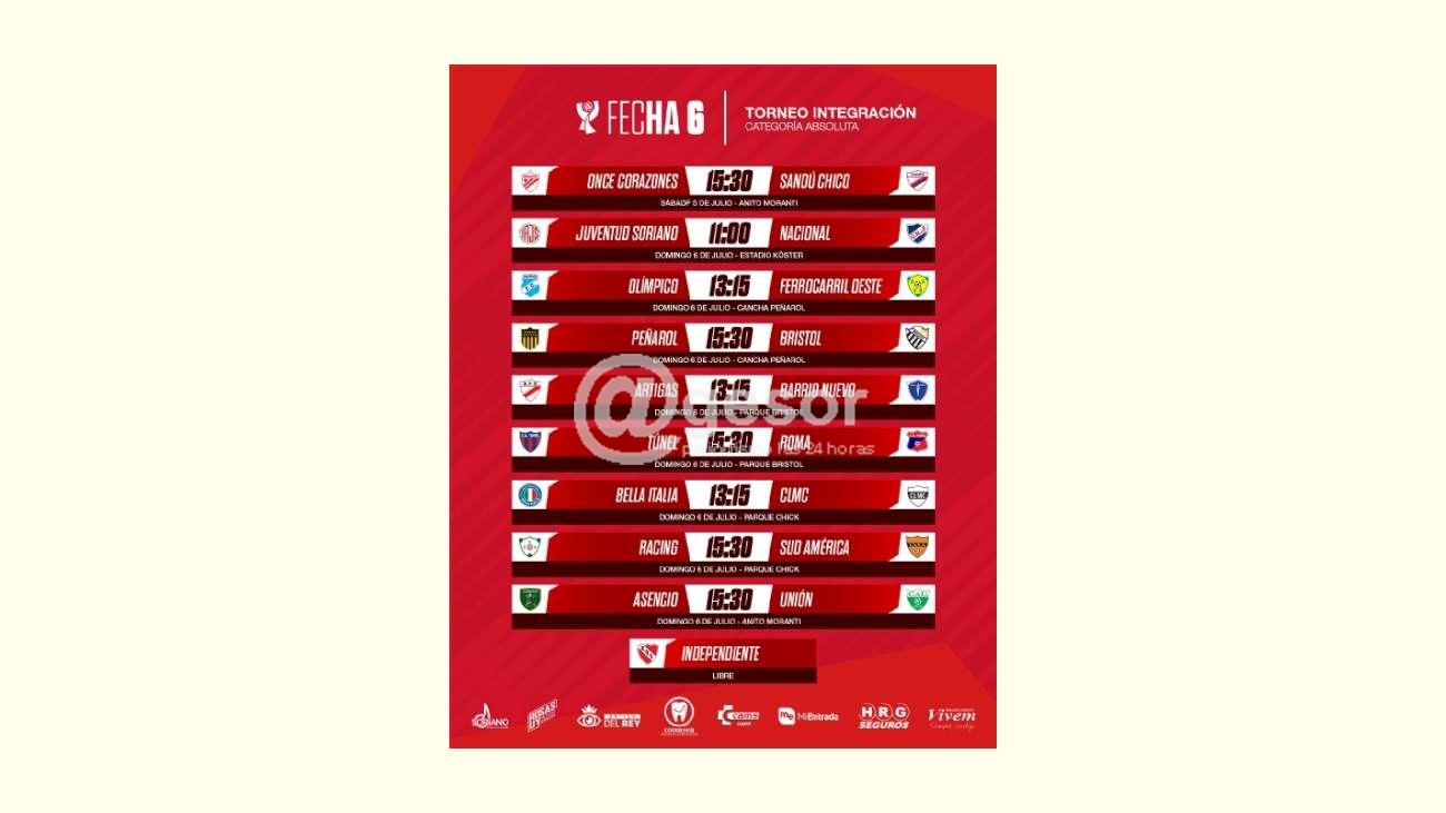 Se reunió la liga departamental de fútbol de Soriano bajo la presidencia del Dr. Pablo Marrero a los efectos de fijar la 6ta fecha del torneo de categoría absoluta. En ese sentido se estará jugando el día sábado 15 y 30 horas en cancha Anito Morantti,  Once Corazones y Sandu Chico, jugando ese día por el aniversario del Once. Mientras que el Domingo 6 se completa la fecha jugando a las 11 horas en el Estadio Koster,  Juventud Soriano y Nacional . Y en la Tarde en cancha de Peñarol y desde 13 y 15 horas lo harán Olímpico y Ferrocarril,  y a las 15 y 30 horas jugaran Peñarol y Bristol.