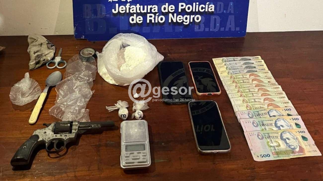 Posteriormente, se efectuó un control en el kilómetro 298 de la ruta 2, donde se detuvo el vehículo y se lo registró, igual que a sus ocupantes, encontrando e incautando: cuatro envoltorios con un total de 508,7 gramos de cocaína, un revólver calibre 32 largo, 16.500 pesos, dos celulares, una balanza de precisión, una cuchara con restos de sustancia, envoltorios de nailon para preparar dosis.