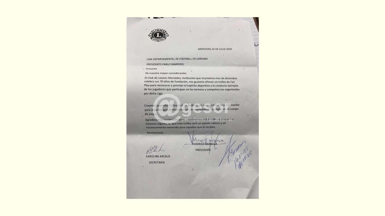 En la reunión del día de ayer de la Liga Departamental de Fútbol de Soriano, se recibió nota del Club Leones Mercedes, institución que el próximo mes de diciembre celebra los 70 años de vida, y en ese sentido ofreció un trofeo Fair Play para reconocer y premiar el espíritu deportivo y la conducta ejemplar de los jugadores que participan del torneo. Informa el club de Leones que el trofeo será un símbolo de reconocimiento y motivación para aquellos que demuestren un comportamiento ejemplar en el campo de juego. En ese sentido, los clubes de la liga de fútbol mercedario recibieron la propuesta aceptando la misma y enviando nota agradeciendo por entenderla de suma importancia para el deporte.