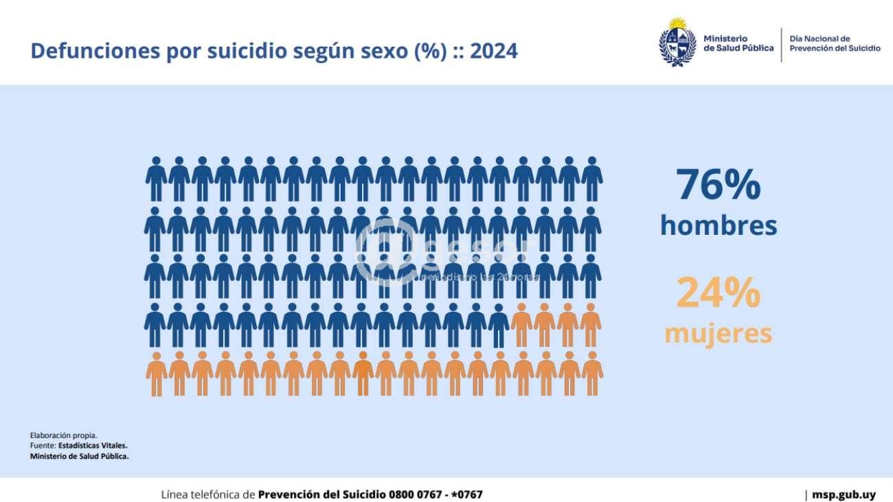 En base a relevamientos estadísticos del propio Ministerio de Salud Pública las defunciones por suicidio afectan mayoritariamente a los hombres (76%) en tanto las mujeres 24%.
