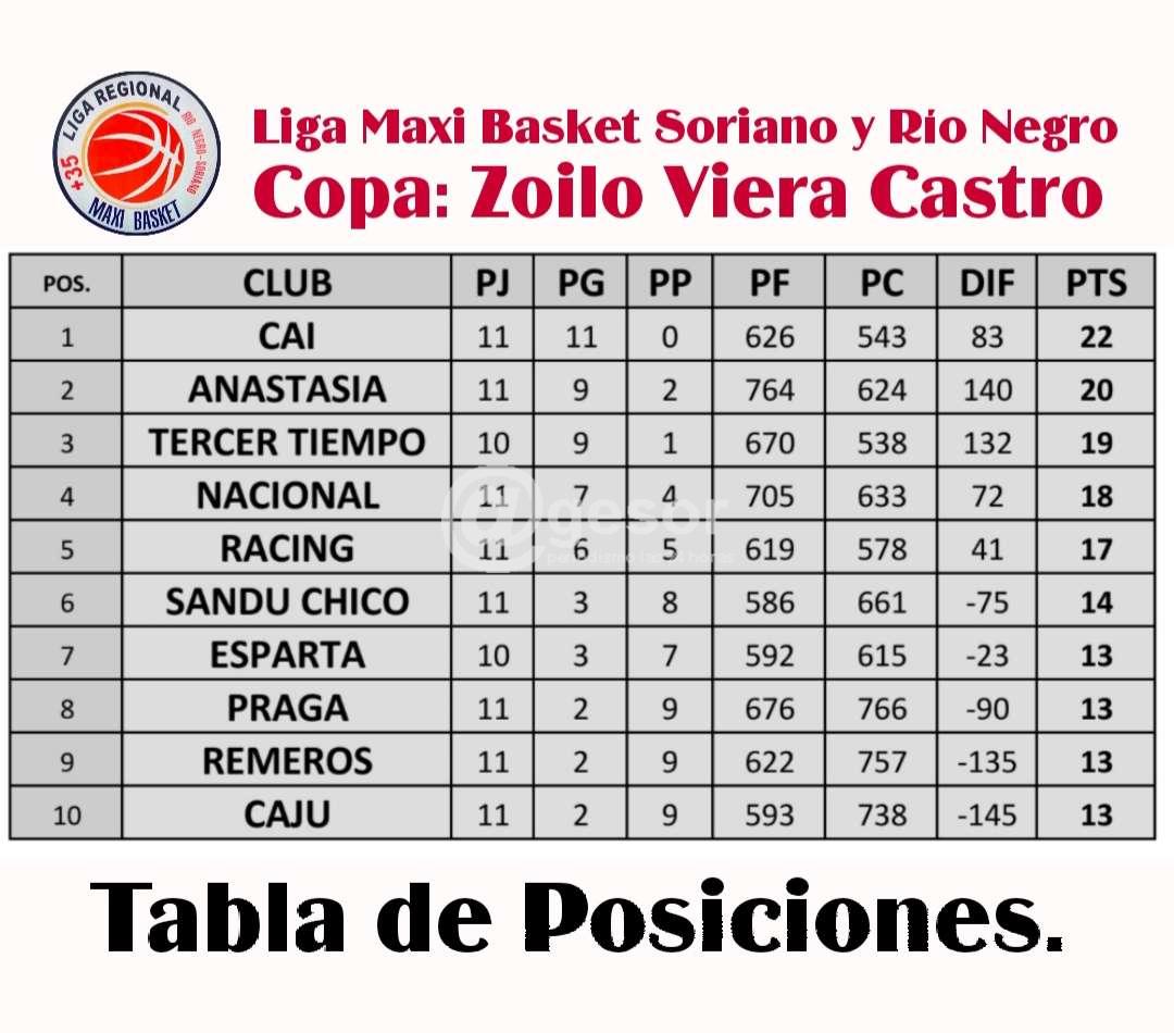Tabla de Posiciones: Independiente 22 pts, Anastasia 20 pts, Tercer Tiempo 19 pts (1 partido menos), Nacional 18 pts, Racing 17 pts, Sandú Chico 14 pts, Esparta 13 pts (1 partido menos), Praga 13 pts, Remeros 13 pts, CAJU 13 pts.