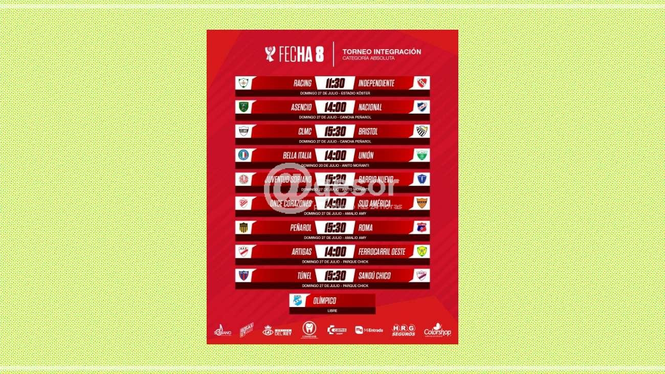 En el Amy jugarán desde las 14 Once Corazones y Sud América, y desde las 15 y 30  horas Peñarol y Roma;   y en el Parque Chick jugarán desde las 14 horas Artigas y Ferrocarril,  y desde las 15 y 30 horas  lo harán Túnel y  Sandú, quedando libre Olímpico.