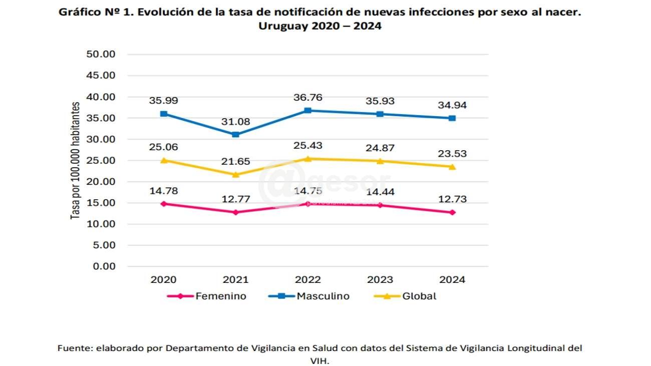 En 2024 se diagnosticaron 842 nuevos casos de VIH, lo que representa una tasa de 23,5 por cada 100.000 habitantes. El 91,7% de las personas con VIH conocen su diagnóstico, el 83% están en tratamiento antirretroviral y el 77,2% presentan carga viral indetectable. La vía sexual sigue siendo la principal forma de transmisión. La mortalidad por causas vinculadas al VIH/SIDA se redujo a 3,2 por 100.000 habitantes, la cifra más baja en cinco años.