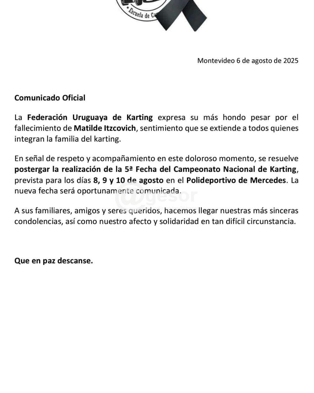 La Federación Uruguaya de Karting en un comunicado expresó “su más hondo pesar por el fallecimiento de Matilde Itzcovich, sentimiento que se extiende a todos quienes integran la familia del karting. En señal de respeto y acompañamiento en este doloroso momento, se resuelve postergar la realización de la 5ª fecha del Campeonato Nacional de Karting prevista para los días 8, 9 y 10 de agosto en el Polideportivo de Mercedes”.