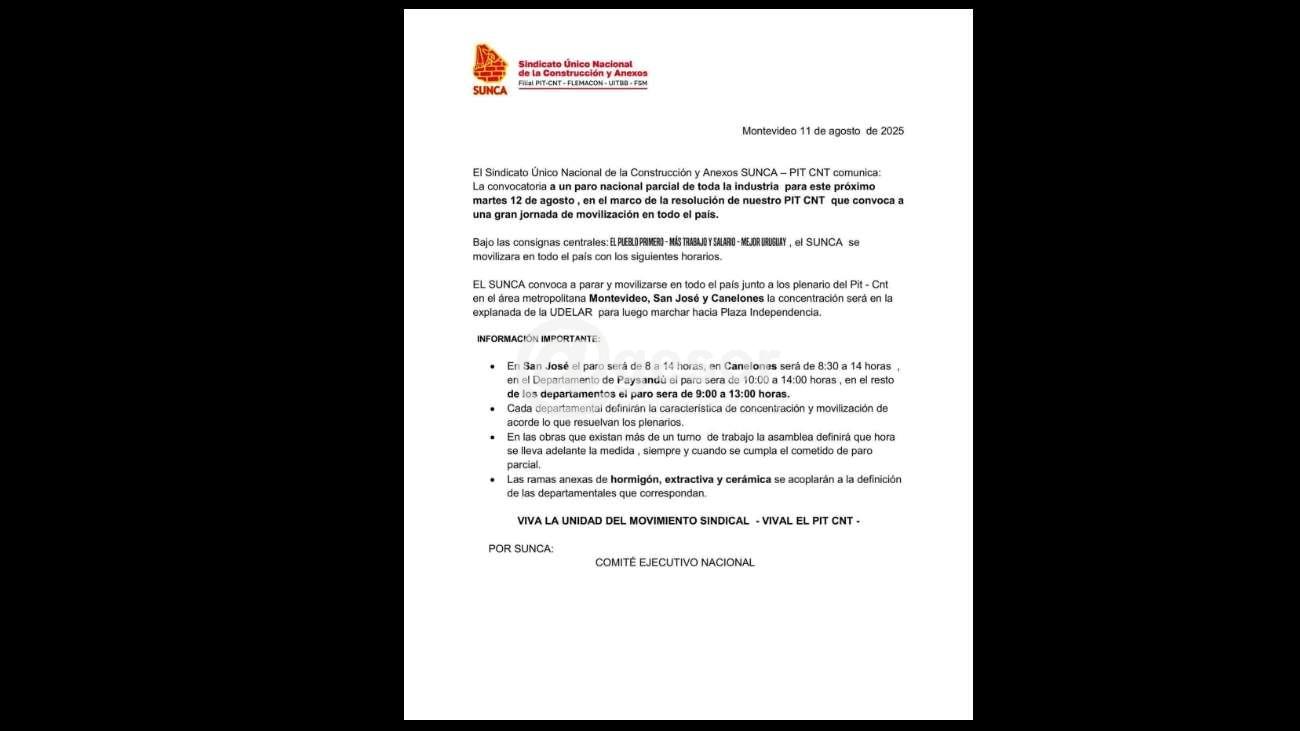 En el marco de la resolución del PIT CNT de realizar una gran movilización en todo el país, el SUNCA convoca a paro parcial nacional de la construcción.