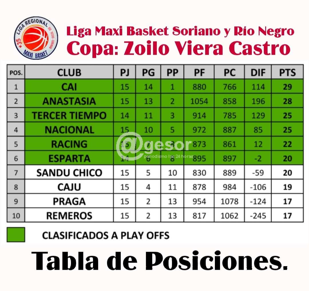 Se completó la fecha Nro. 14 de la Liga de Maxi Basket donde Independiente se mantiene firme arriba al vencer a Sandú Chico, Anastasia venció a Tercer Tiempo en un duelo directo por el 2do lugar de la 1ra fase, CAJU derrotó a Remeros por amplio margen y queda cerca de la clasificación, Racing hizo lo propio con Praga partido que se definió en la última bola y Nacional venció de visita en el “16 de Junio” a Esparta.