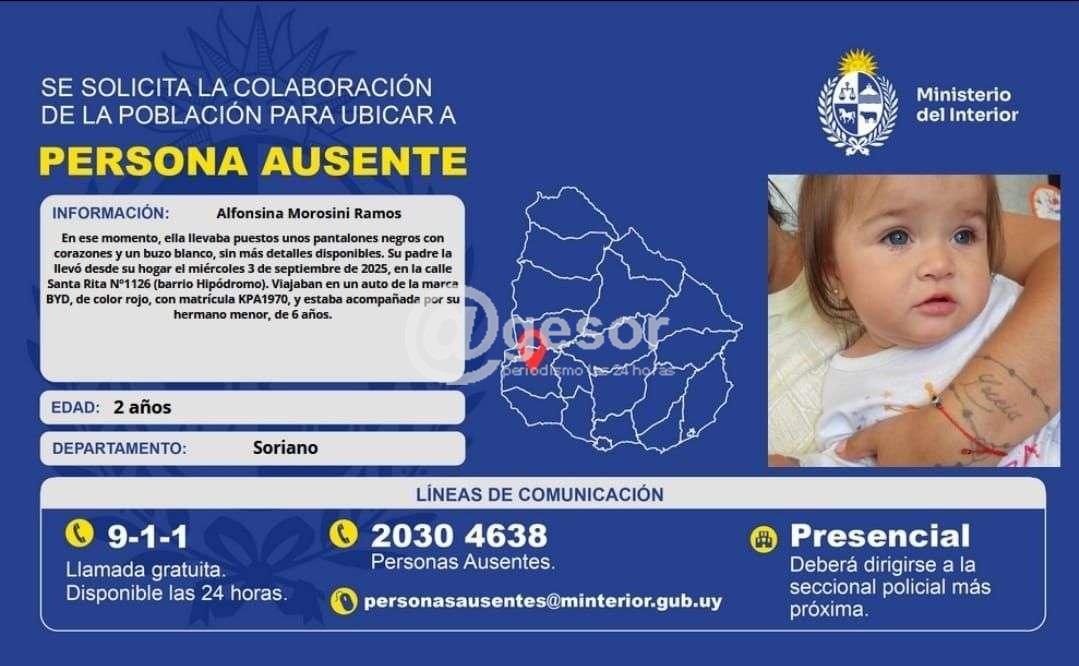 Le Jefatura de Policía de Soriano solicita la colaboración de la población para ubicar a persona ausente: Alfonsina Morosini Ramos de 2 años.