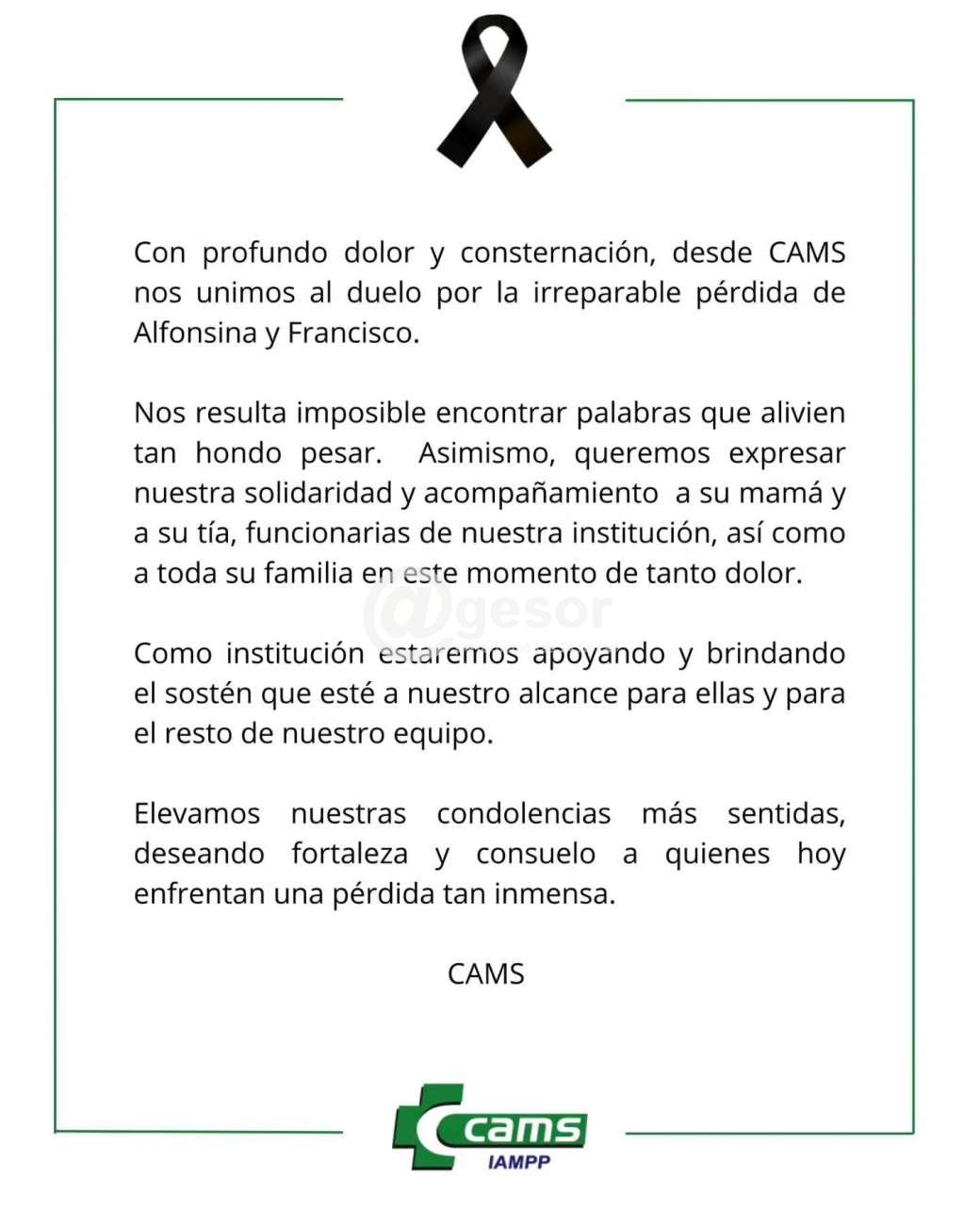 Con profundo dolor y consternación, desde CAMS nos unimos al duelo por la irreparable pérdida de Alfonsina y Francisco.