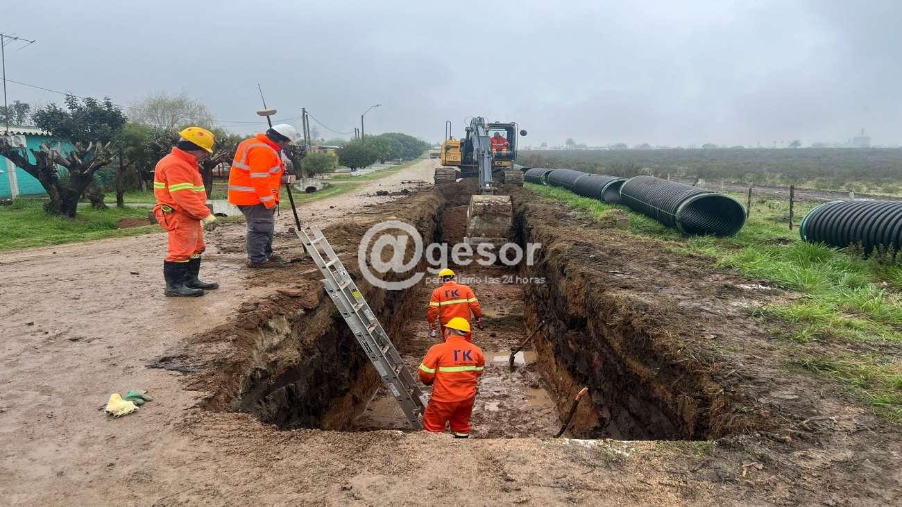 Actualmente las tareas se concentran en el sector oeste del barrio, principalmente con las excavaciones para los colectores. Allí se construye el tramo de descarga final en calle 52, entre calle D y calle 37, con la colocación de tubería de PEAD de 1 m. de diámetro, mientyras se prepara la excavación en calle 52 hacia calle 39, donde se procederá a instalar un colector de 60 cm. de diámetro.