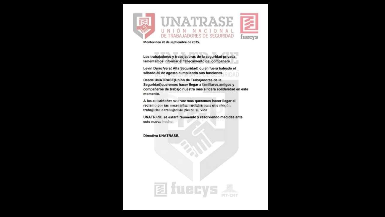 La Unión Nacional de Trabajadores de Seguridad (UNATRASE) comunicó este sábado el fallecimiento del guardia Levín Darío Vera, quien había sido baleado el pasado 30 de agosto mientras cumplía con sus funciones. A través de un comunicado, el sindicato lamentó la pérdida del trabajador, empleado de la empresa Alta Seguridad, y expresó su