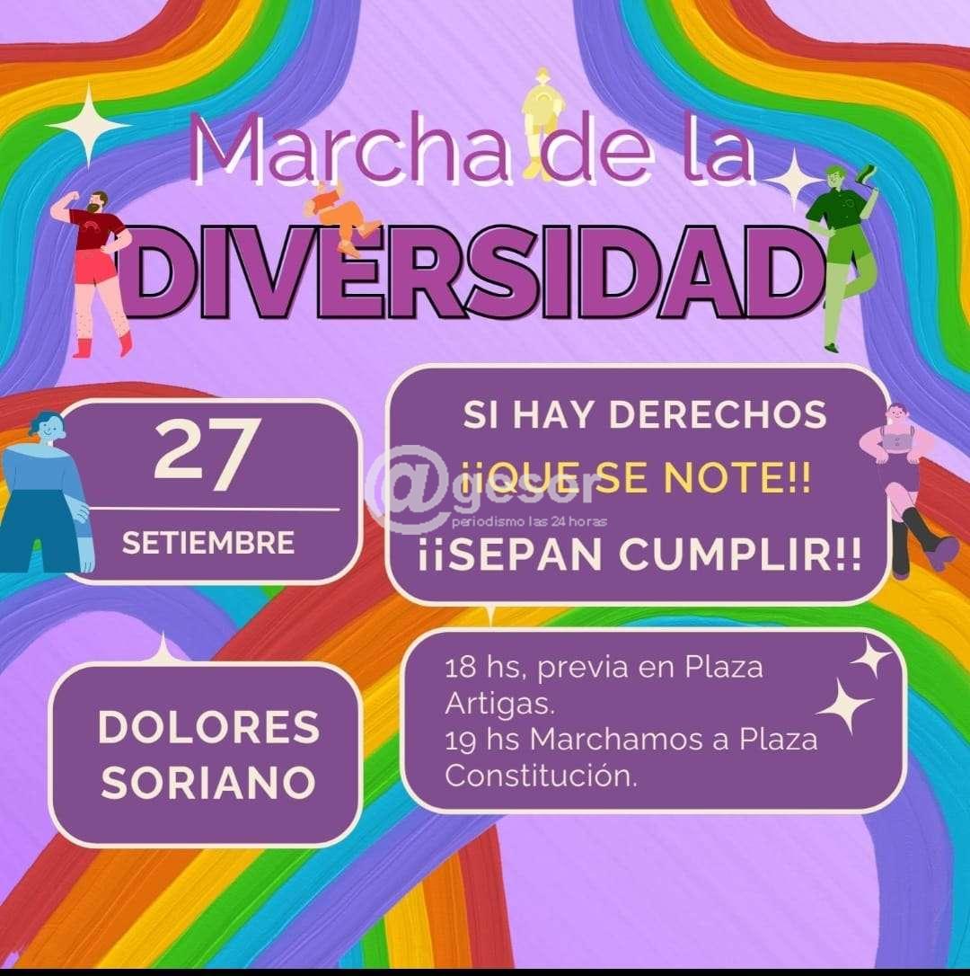 Bajo la consigna "Si hay derechos, ¡QUE SE NOTE! ¡SEPAN CUMPLIR!" Dolores se prepara para otra marcha de la Diversidad que se realiza este sábado 27 de setiembre con una concentración previa a las 18.00 horas plaza Artigas y a las 19.00 se iniciará la marcha hacia plaza Constitución.