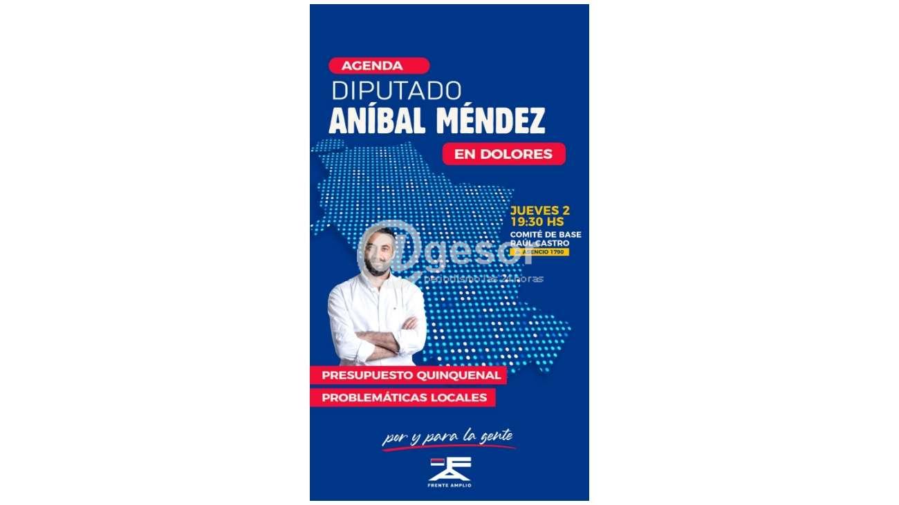 El diputado Aníbal Méndez estará participando en Dolores de una charla abierta sobre el presupuesto quinquenal y las problemáticas locales. Será en el Comité de Base Raúl Castro (Asencio 1790), este jueves 2 de octubre a partir de as 19,30 horas.