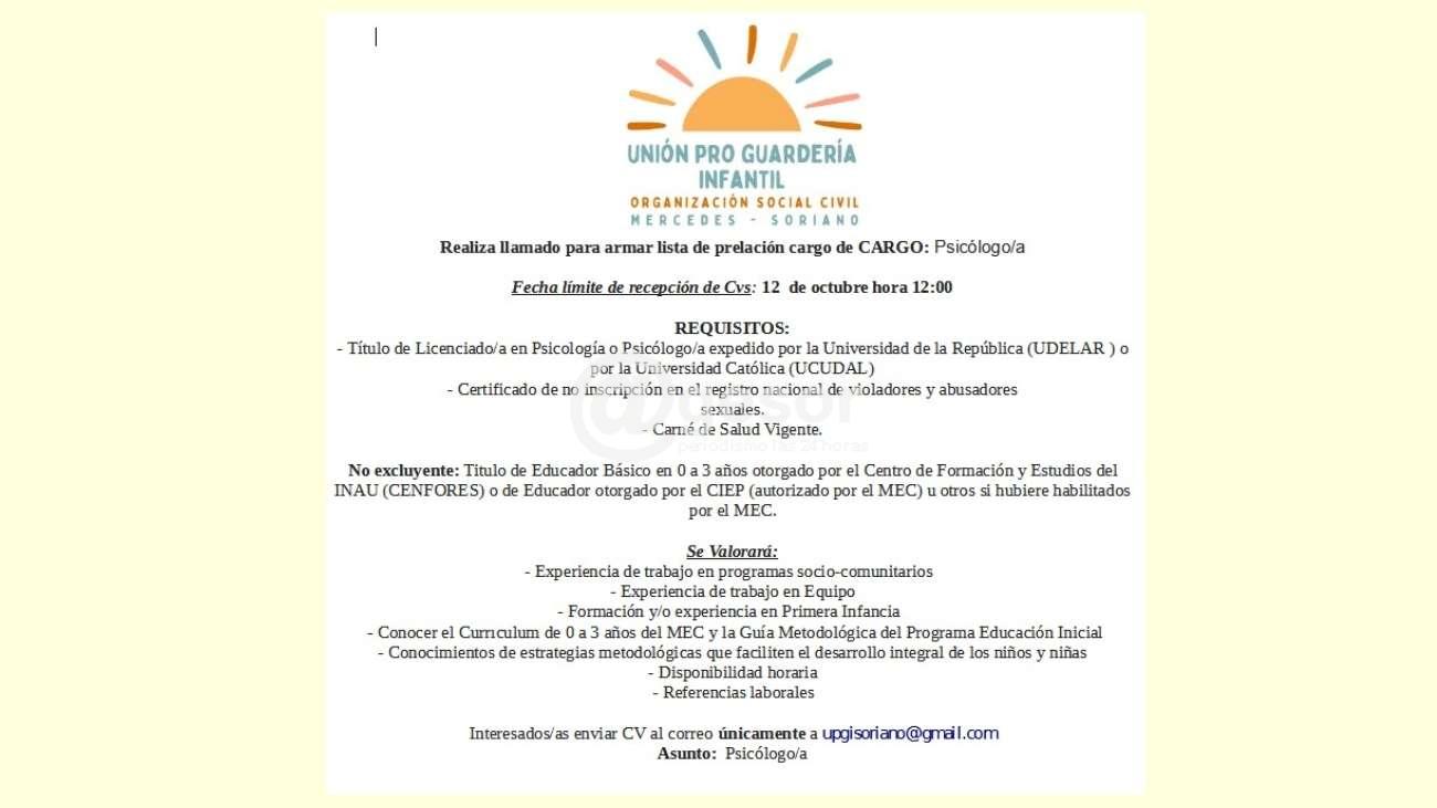 Unión pro guardería infantil: llamado a cubrir un cardo de psicólogo/a
