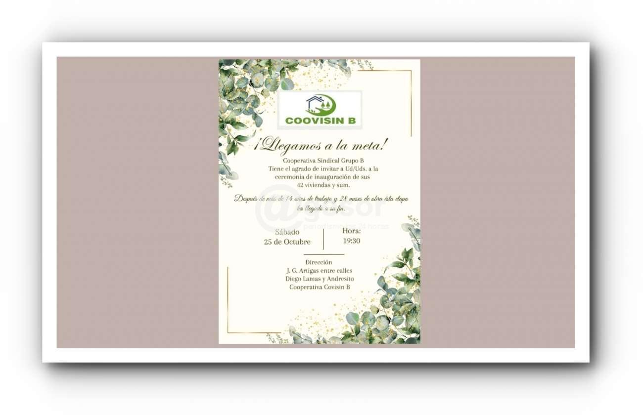 Cooperativa Sindical Grupo B invita a la ceremonia de inauguración de 42 viviendas y salón de usos múltiples.