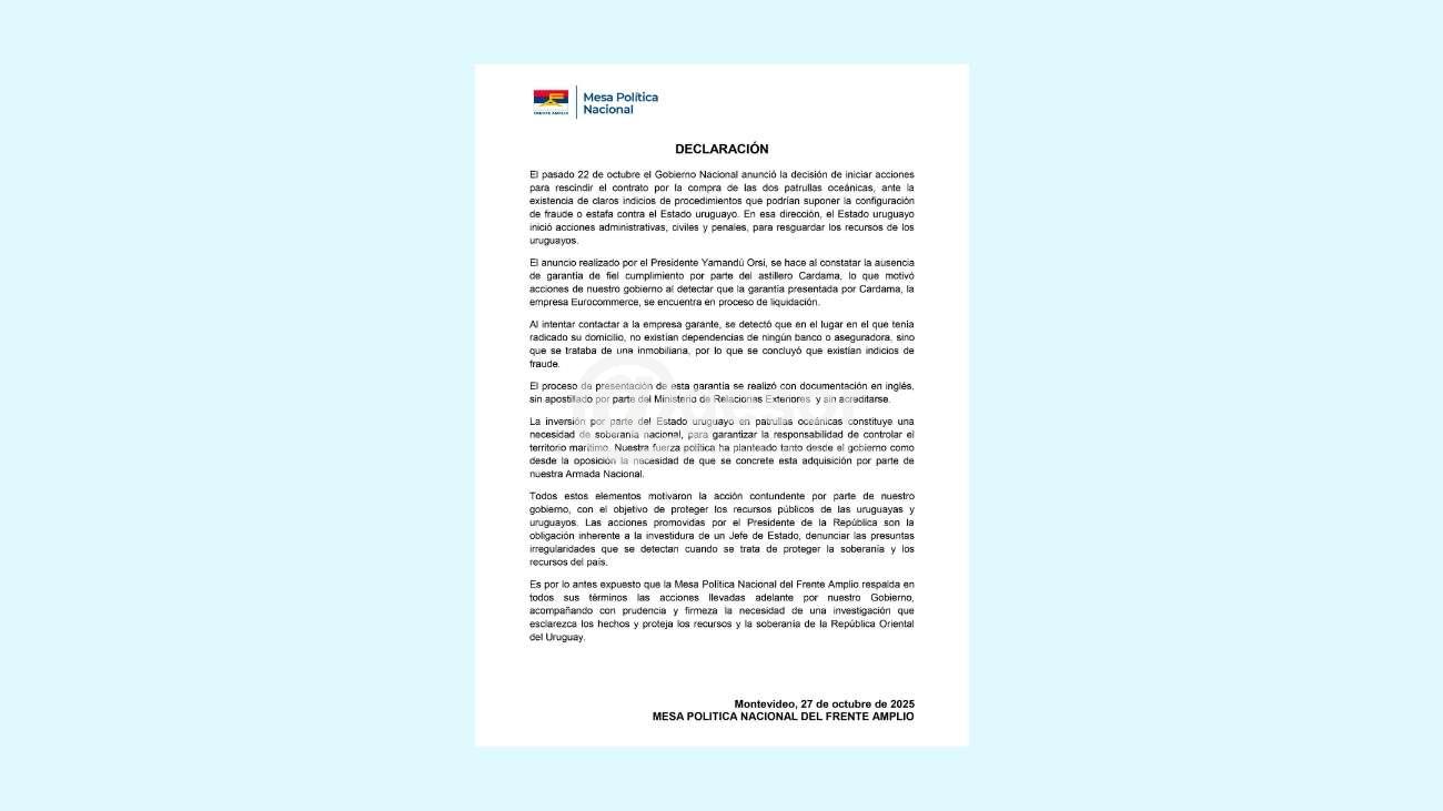 Es por lo antes expuesto que la Mesa Política Nacional del Frente Amplio respalda en todos sus términos las acciones llevadas adelante por nuestro Gobierno, acompañando con prudencia y firmeza la necesidad de una investigación que esclarezca los hechos y proteja los recursos y la soberanía de la República Oriental del Uruguay.