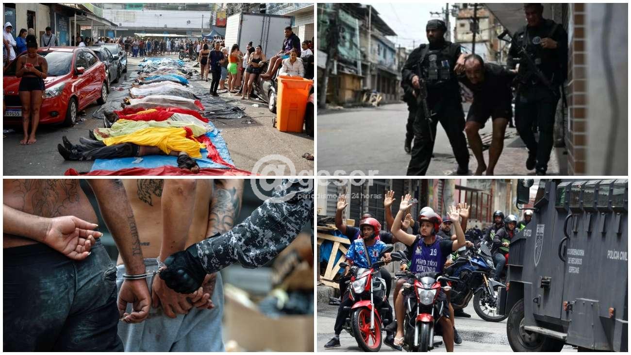 Comando Vermelho enfrentó a la policía con barricadas y bombas lanzadas desde drones, lo que aumentó el número de víctimas entre civiles. Murieron también cuatro policías y entre los heridos se cuentan seis detectives. El Gobernador de Rio de Janeiro, Cláudio Castro, dijo que fue el mayor operativo policial de la ciudad. Así mismo declaró que la operación se inició con una investigación hace un año con las pertinentes órdenes judiciales. La planificación de la operación duró dos meses. “Fue un operativo estatal contra los narcoterroristas”, cerró el Gobernador Castro.