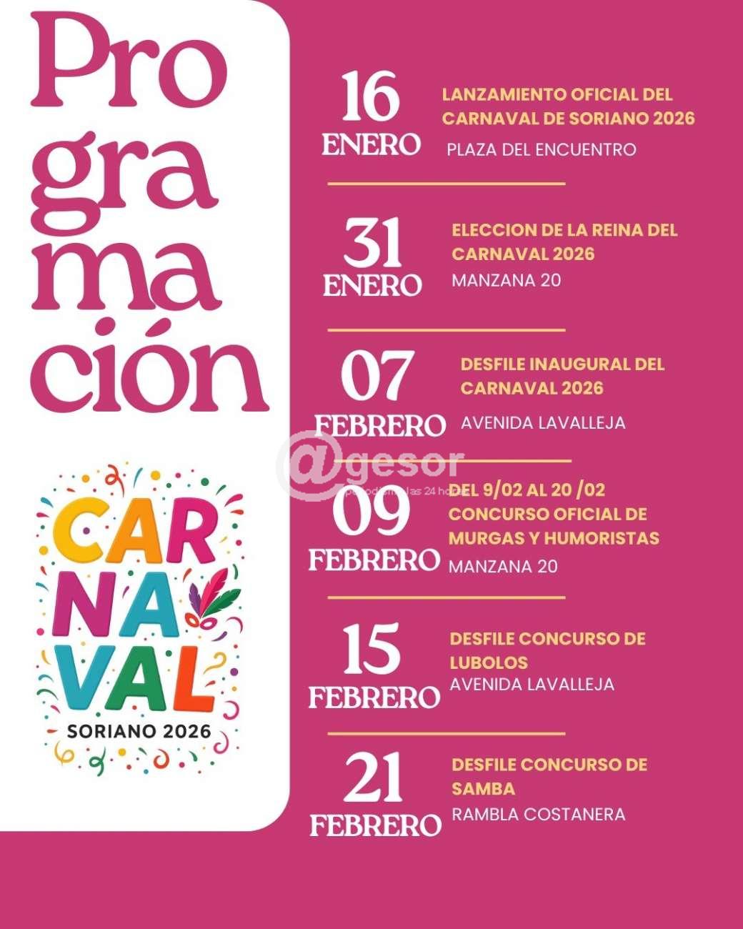 Se dio a conocer la programación de Carnaval de Soriano cuya organización está a cargo del Departamento de Cultura de la Intendencia, con un grupo de funcionarios especialmente asignados a estas celebraciones, encabezados por Andrea Dibble, junto a otros compañeros, quienes se encargan de todo lo referente a la fiesta de Momo, como lo vienen haciendo desde hace años.