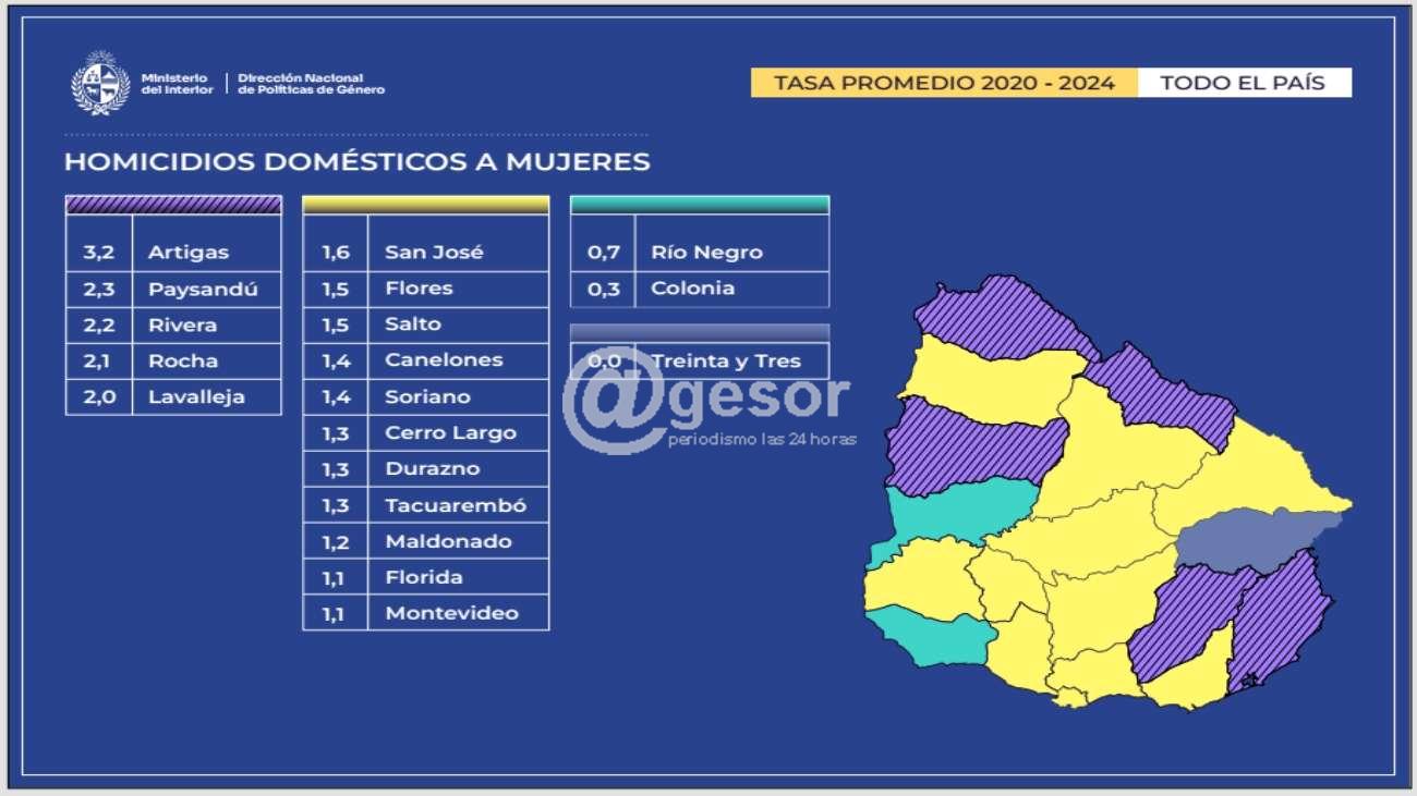 Al analizar el promedio de las tasas anuales para el período 2020-2024 por departamento, observamos que Artigas presenta la tasa más alta, con 3,8 homicidios a mujeres por violencia basada en género cada 100.000 mujeres, seguido por Rivera, Lavalleja y Paysandú.
