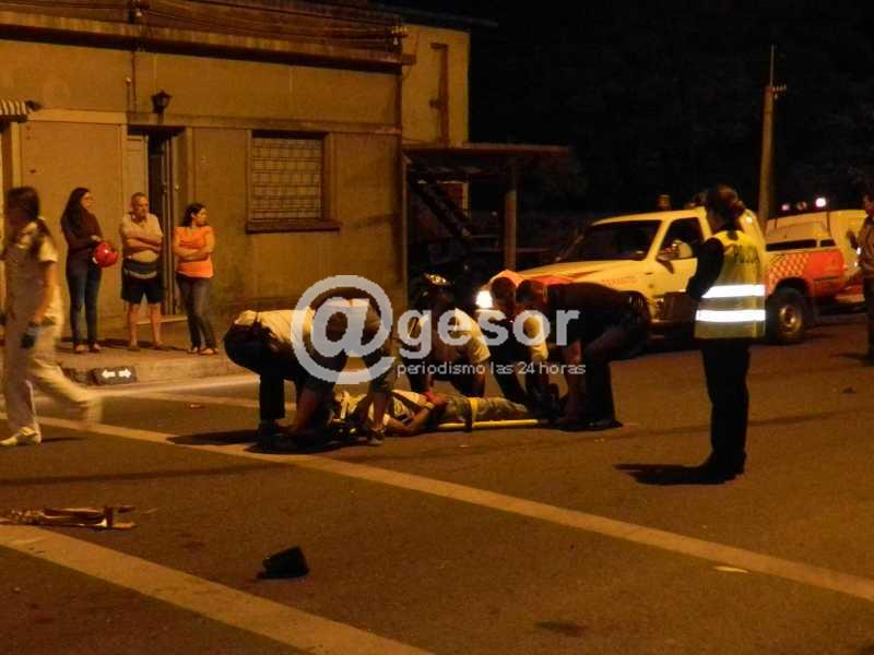 En el medio de la calzada quedó caído el conductor de la moto que recibió atención en el lugar y fue trasladado en ambulancia de EMS al Hospital "Chelle" donde en primera instancia se le diagnosticó erosiones, corte en uno de los codos y se le practicaba rayos X para determinar la entidad de los golpes recibidos, ya que el impacto fue violento y el automóvil pasó por arriba a la moto en determinado momento.
