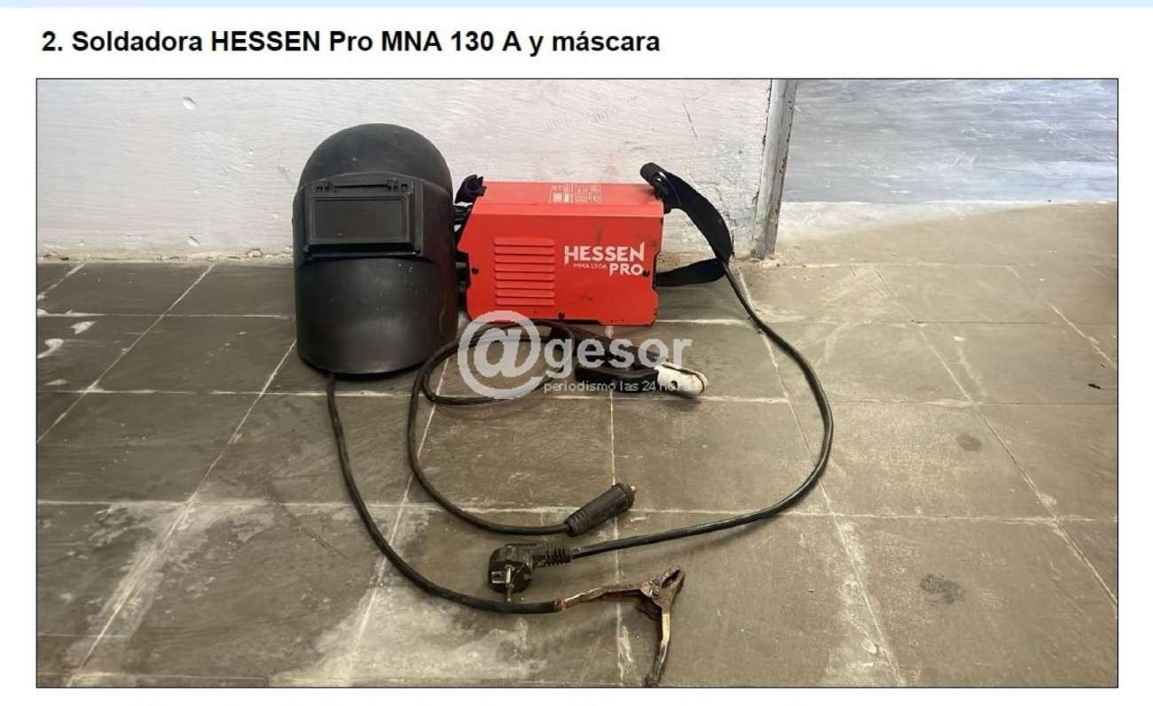 2. Soldadora marca HESSEN Pro, modelo MNA 130 A, color naranja, y máscara para soldar color negro.