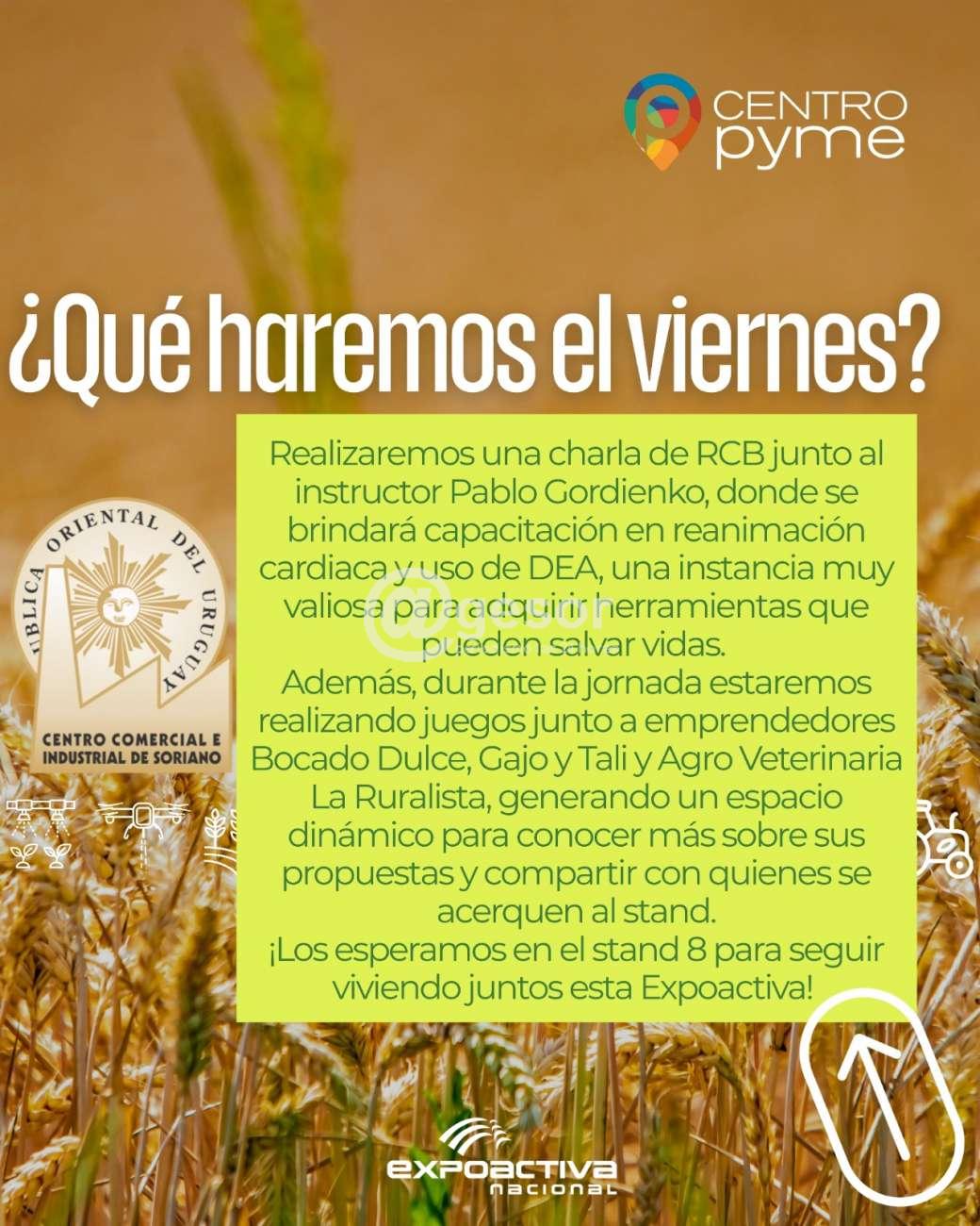 El Centro Comercial e Industrial de Soriano, junto a Centro Pyme, anuncia su participación en la 29ª edición de Expoactiva Nacional, con actividades de capacitación, charlas técnicas y espacios de encuentro con emprendedores locales en el stand 8.