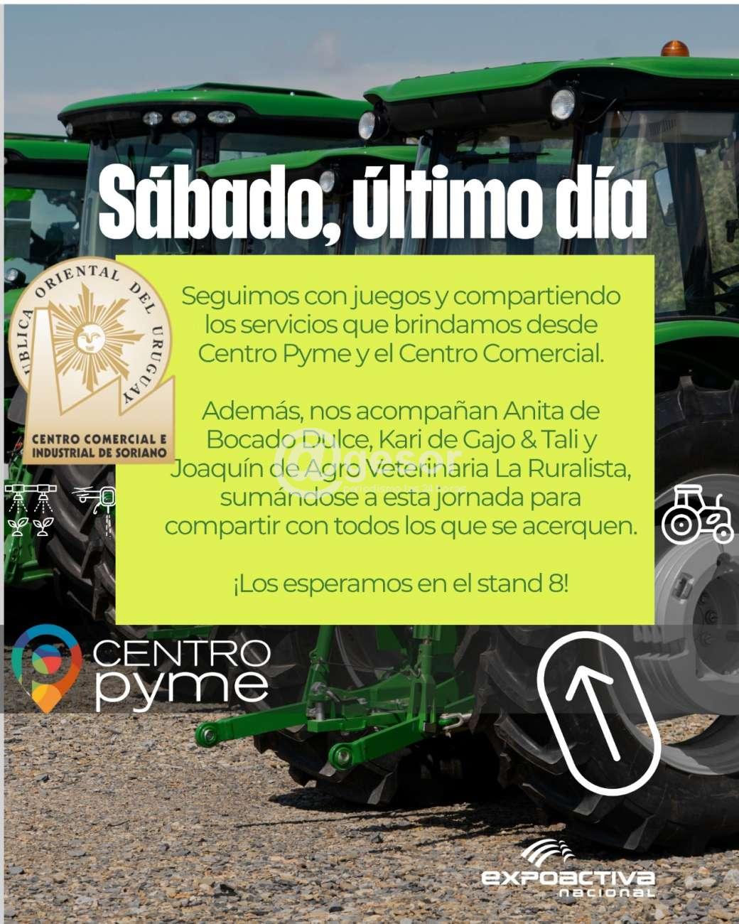 Durante la Expoactiva Nacional, el Centro Comercial e Industrial de Soriano y Centro Pyme estarán presentes con una agenda variada de propuestas. A lo largo de las jornadas se realizarán juegos y dinámicas para dar a conocer los servicios que ambas instituciones brindan diariamente, generando un espacio de intercambio con el público.