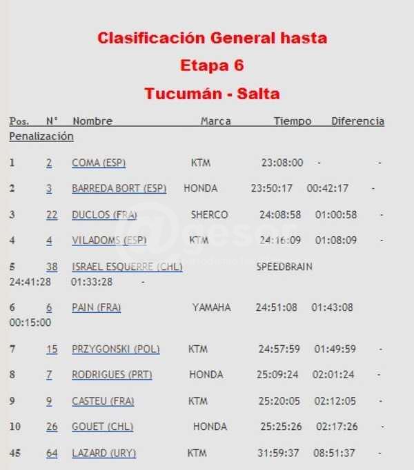 Así lo sintió el piloto uruguayo Laurent Lazard (KTM) quien en esta sexta etapa de este Rally Dakar2014 Argentina-Bolivia-Chile, que fue de Tucumán a Salta con un total de 464 kilómetros, nuevamente volvió a escalar posiciones en la General.