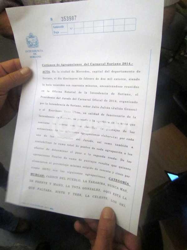 (por Martín Corujo) Ya pasada la medianoche, en los primeros minutos de este jueves, el Presidente del Jurado del Concurso Oficial de Agrupaciones de Carnaval de Soriano 2014, Julio Julián, junto al Escribano designado por la Intendencia de Soriano, Enzo Ubios, realizaron la sumatoria de los puntajes obtenidos por todas las agrupaciones en la primera ronda y establecieron cuales superaron el 65% del total de puntos posibles, los que pasaron a la segunda ronda del certamen de carnaval.